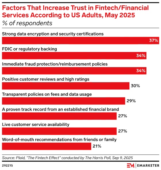 Key stat: Strong data encryption and security certifications are the top factor that increases trust in fintech/financial services, according to May 2025 data from Plaid and The Harris Poll. | | | |