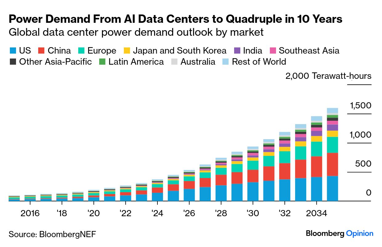 This is Bloomberg Opinion Today, the single-minded pursuit of global efficiency of Bloomberg Opinion’s opinions. On Sundays, we look at the major themes of the week past and how they will define the week ahead. Sign up for the daily newsletter here. Electricity is magic. Don’t believe me? When you return to your darkened home tonight, flip a switch on the wall and then, abracadabra!, you are in a room that’s bright as the sunniest day of the year. Even more magical, if you are like me and are returning to piles of dirty laundry and dirtier dishes, flip that switch back and, voila!, your chores are done and you can order Seamless. Electricity is magic. Hollywood has always known this, and not just because of the whole “lights, camera, action!” thing. Just think of the robot Maria coming to life in Fritz Lang’s Metropolis, of Gene Wilder’s “It’s alive!” in Young Frankenstein, of the DeLorean time machine’s return to the present in Back to the Future, of the magical and AC vs. DC rivalries in Christopher Nolan’s underrated The Prestige, of D.W. Griffith’s The Birth of a Nation, which President Woodrow Wilson reportedly said was “like writing history with lightning.” [1] Electricity is magic. And now it is the Pledge, Turn and Prestige in the greatest magic trick in human history: artificial intelligence. The problem is, it takes a whole lot of magic to make a machine as smart as a human. And Woofle dust ain’t gonna cut it. Turns out, of course, that an energy crisis is a miraculous opportunity, and plenty of folks are rushing to make green off the blackout, including … former Texas Governor Rick Perry? The energy firm Perry co-founded, Fermi Inc., hit a valuation of $19 billion on its first day of trading. Have they created a nuclear-powered miracle, or a magic bubble? “Fermi has several trappings of a bandwagon IPO. Its stated mission is to ‘power the artificial intelligence needs of tomorrow,’” writes Liam Denning. “What defines the AI boom, above all else, is a desire to deploy capacity yesterday. It is the job of the ambitious electricity executive to funnel that desire and as much of the gargantuan quantity of money behind it as possible into their own coffers, and quickly. The advanced nuclear startups, however promising their technology might be, cannot do this; they are, at best, years away from commercial operation at scale.” While AI may be the technology of the the future, its still runs on the past’s blackest art: The good news for AI, if the bad one for humanity, is that fossil-fuel enthusiasts are back in power. “President Donald Trump’s current government includes 43 former employees of the industry,” writes Mark Gongloff. “The US economy has suffered $6.6 trillion in economic damages from climate-related disasters in the past 12 years, Bloomberg Intelligence has estimated, making it a costlier event over that time period than the Great Depression. US workers lost more than $1 trillion in wages because of wildfire smoke alone between 2020 and 2024, Bloomberg Intelligence has estimated. These are mere down payments for future damage.” That dismal future has already arrived in, no surprise, Rick Perry’s Texas. “Imagine being marched by force through a desert with barely anything to drink while your captor repeatedly cools himself by dumping gallons of water on his head, and maybe you’ll start to get a sense of what it’s like to live in Texas these days,” writes Mark in a separate column. “Water supplies in South Texas, already stretched thin after a seven-year dry spell, are being further strained by thirsty oil refineries, petrochemical plants and other energy-related industries that have boomed in Corpus Christi in recent years, Bloomberg News reported recently.” Turns out that the massive energy suck might not even be the biggest hurdle for AI. Rather, it’s China’s President Xi Jinping, who controls more than 90% of the world’s refined exports of the rare-earth minerals necessary for high-speed chips, data storage, batteries, optical communications and pretty much everything else. “China’s threat to curb the supply of rare-earth elements, which are crucial for making goods from autos and aircraft to headphones and vacuum cleaners, is a symptom of riding for too long the peace dividend after the Soviet Union’s collapse in the 1990s. The single-minded pursuit of global efficiency, supercharged by China’s entrance in the World Trade Organization in 2001, has backfired,” writes Thomas Black. “The current predicament of China’s rare-earth dominance is worth noting for those urging a speedy demise of oil and gas that’s plentiful in the US in favor of wind turbines, solar panels and lithium batteries for energy storage — all areas now dominated by China. Handing over US energy security to China would create an even bigger national security threat.” David Fickling, however, thinks the US could easily slip out of China’s stranglehold. “Given the ability of the words rare earths to bring the leadership of the world’s largest economy to its knees, it’s tempting to think that establishing a supply chain to produce the minerals outside of China is a challenge on the scale of putting a man on the moon,” he writes. “In fact, that’s a vast overestimate. The amount of government spending needed to bulletproof most of the world’s supplies of the elements is tiny. It’s probably on the order of a single White House ballroom ($200 million), or six hours of spending on AI data centers by Silicon Valley’s hyperscalers ($350 million). By some measures, governments might even turn a profit on the transaction.” John Authers questions whether Beijing’s new export controls on the mighty minerals might be a bluff. “China’s moves to tighten curbs on rare earths last week, and then early Tuesday to add controls over companies involved in shipping them, punctuated with President Don