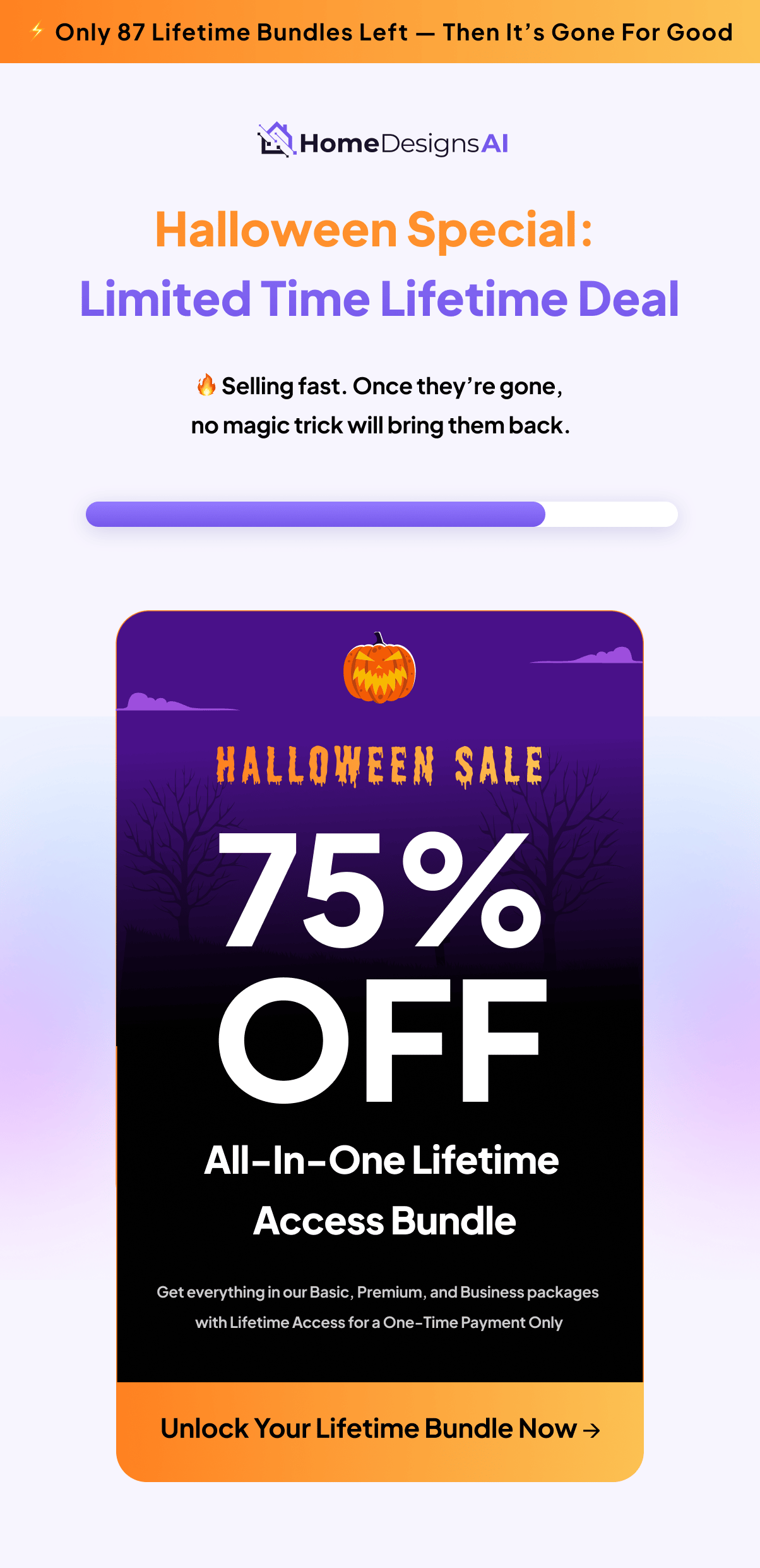 Denis here from HomeDesignsAI, and I'll keep this quick. The response has been unreal. Only 87 copies left to secure HomeDesignsAI for life with 75% OFF the total value.