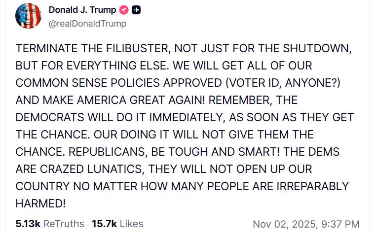 Trump wants Republicans to kill the filibuster. Great!In the long run, it would be good for Democrats and democracy.Public Notice is supported by paid subscribers. Become one ⬇️ With the government shutdown entering its second month, President Trump has found his solution: Senate Republicans should eliminate the filibuster, which they can do with a simple majority vote. Do that, and Democrats will no longer stand in their way. They can end the shutdown tomorrow and without giving up anything. Then they can get to passing the rest of the GOP’s legislative agenda. As much as he might like the idea, it’s hard to know how committed Trump is to it. So far, he hasn’t put serious pressure on Senate Republicans to do his bidding on the filibuster (though he reportedly might start squeezing them soon). But Democrats should hope he does, and that he gets GOP senators to fall in line. That’s because even though filibuster elimination would be bad in the short term — that is, at least through the midterm elections, at which point Democrats may take control of one or both houses of Congress — in the long run it would still be good for both progressive policy priorities and the responsiveness of our democracy. Short term pain, long term gainWe haven’t had the filibuster debate in a while, but it usually comes up when Democrats are in control and find themselves thwarted by Republicans. The filibuster allows the minority party to kill almost any bill in the Senate. No matter how popular it might be, without 60 votes for passage, even the most worthy legislation will die. Joe Biden was only the latest Democrat to find his agenda ground to a halt despite having majority support in both houses for much of what he wanted to pass. Over time the filibuster has been altered and changed. It can no longer be deployed against judicial and executive branch nominations, and Mr. Smith Goes to Washington-style “talking filibusters” are no longer used to stop legislation (though every now and then a senator conducts a speaking marathon just to draw attention to an issue). The basic logic of maintaining the filibuster is this: We’d rather get none of what we want, so long as we can stop the other party from getting anything it wants. There are some in both parties who feel this way. The problem from the perspective of Democrats is that they are the party that wants an activist government. To put it another way, they simply want to do more things than Republicans do, so a status quo of near-total gridlock extending indefinitely hurts them more than it hurts the GOP, for whom a government unable to solve the country’s problems is a feature, not a bug. |