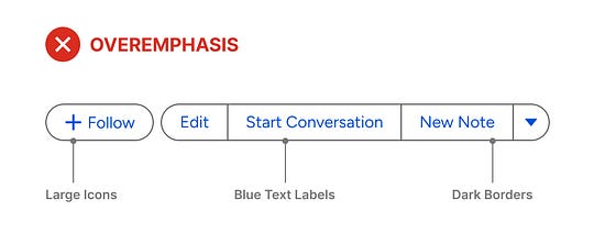 When you think of a “clean” interface, what comes to mind? People often associate it with a design that’s easy to use and look at. However, designers may find it challenging to create an interface that embodies this abstract concept. A truly “clean” design is achieved through the art of de-emphasis. Most designers overemphasize elements, resulting in a cluttered, overwhelming interface. The example below illustrates this perfectly. There are only five buttons, but it feels like there are more. The buttons may work, but they aren’t pleasing to look at or use. The emphasis should be applied to the most important element, while everything else should be de-emphasized. Here, everything is emphasized... Continue reading this post for free in the Substack app |