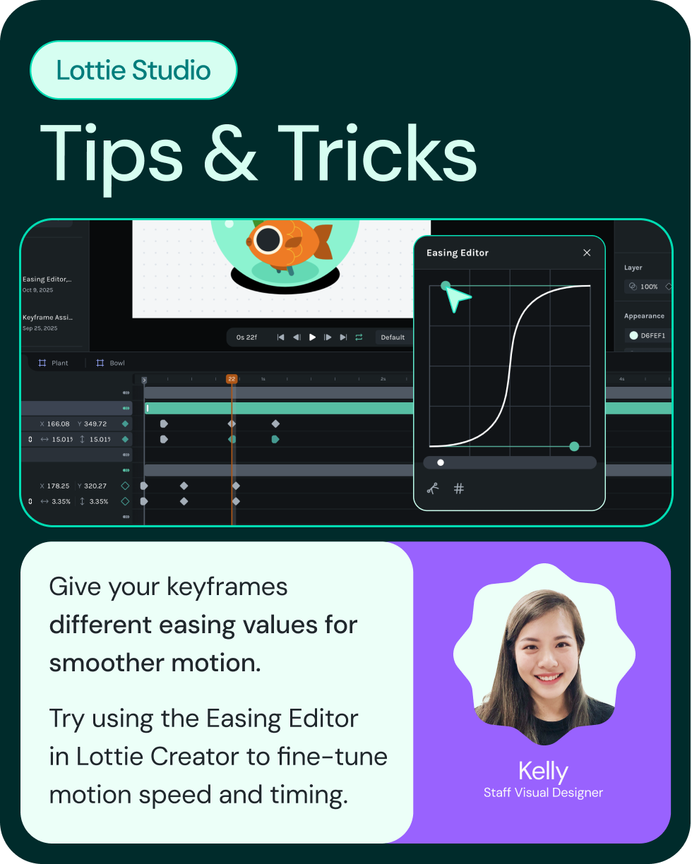 | | | | Introducing Prompt to State Machines | | Building interactivity just got a whole lot easier. The new Prompt to State Machines feature in Lottie Creator lets you describe an animation behavior in plain language and you’ll watch it generate a working state machine for you. No more manual setup or technical complexity! | | | | | | | | Learn more about Prompt to State Machines | | | Explore how to use Prompt to State Machines with a quick tutorial, learn quick tips, and we’ve also added some samples you can start with. | | | | | | | | | | | Lottie State Machines video tutorials | | Dive into our State Machines video tutorials to learn everything about segments, inputs, transitions and more; complete with a step-by-step on creating an interactive radial menu. | | | | | What's new in Lottie Creator | | | | Manage your timeline with Keyframe Assistant | | | Retime, space, or mirror keyframes in one click for faster, more precise animation. | | | | | | | Animate faster with Motion Presets | | | Choose from ready-made effects like bounce, pulse, or jump, or save your own keyframed motions as custom presets to reuse anytime. | | | | | | Add bounce in your Lottie with Spring Curve | | | Add natural bounce, smooth transitions and realistic energy to your animations; all without keyframe math. | | | | | | | Control timing & flow with Easing Editor | | | | <