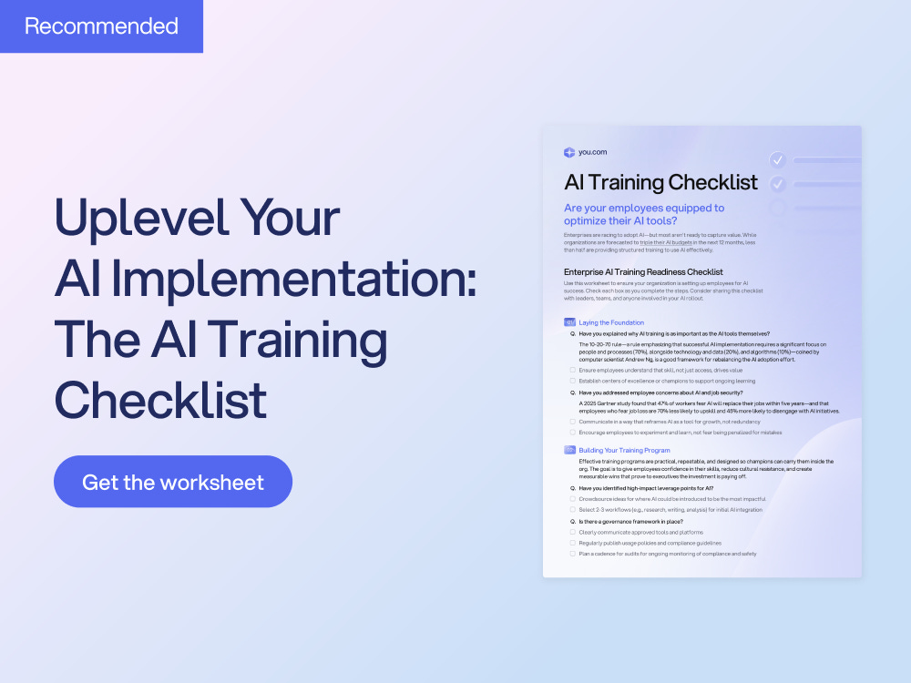 One major reason AI adoption stalls? Training. (Sponsored)AI implementation often goes sideways due to unclear goals and a lack of a clear framework. This AI Training Checklist from You.com pinpoints common pitfalls and guides you to build a capable, confident team that can make the most out of your AI investment. What you’ll get: