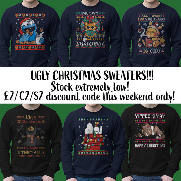 It sure is cold out there! You know what's great for cold weather? Our awesome, warm, EXTREMELY COOL though admittedly QUITE UGLY Christmas Sweaters!!! We have EXTREMELY LIMITED STOCK LEFT, some sizes have already started to sell out, but for THIS WEEKEND ONLY, you can get £2/€2/$2 off with the discount code "StayWarm" (you can use this as many times as you want between now and 23:59 GMT on Sunday 16th). You can actually use this code on any order at all but these Ugly Christmas Sweaters really are great DON'T MISS OUT ;) One final thing - as you may have noticed, Black Friday is soon upon us. You can count on Qwertee to bring the BEST deals of the year so keep an eye out!