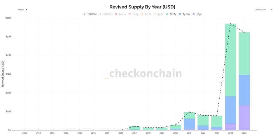 Pokazuje on wolumen sprzedaży Bitcoinów, które mają 5 lat lub więcej. Fioletowy, na samym dole słupka - to Bitcoiny, które mają 10 lat (lub więcej).