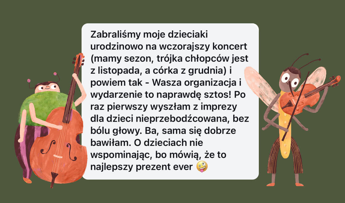 Dzieciaki dopisały: od maluchów w nosidłach po młodszych nastolatków przypominających sobie „piosenki z dzieciństwa” (jakkolwiek to brzmi!). A rodzice? Tańczyli, śpiewali i po prostu świetnie spędzali czas razem z nimi. Wyglądało to rewelacyjnie! A na scenie działo się wszystko naraz: świetni muzycy i wokalistki i wizualne dopełnienie w postaci dopracowanych animacji. Na samo wspomnienie trochę się uśmiechamy, trochę wzruszamy. Zresztą – powodów do uśmiechów i wzruszeń dostarczacie nam także w naszych skrzynkach: