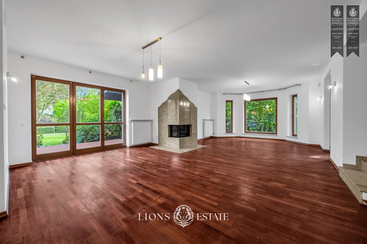 W salonie centralnym punktem jest elegancki kominek wykonany na zamówienie.