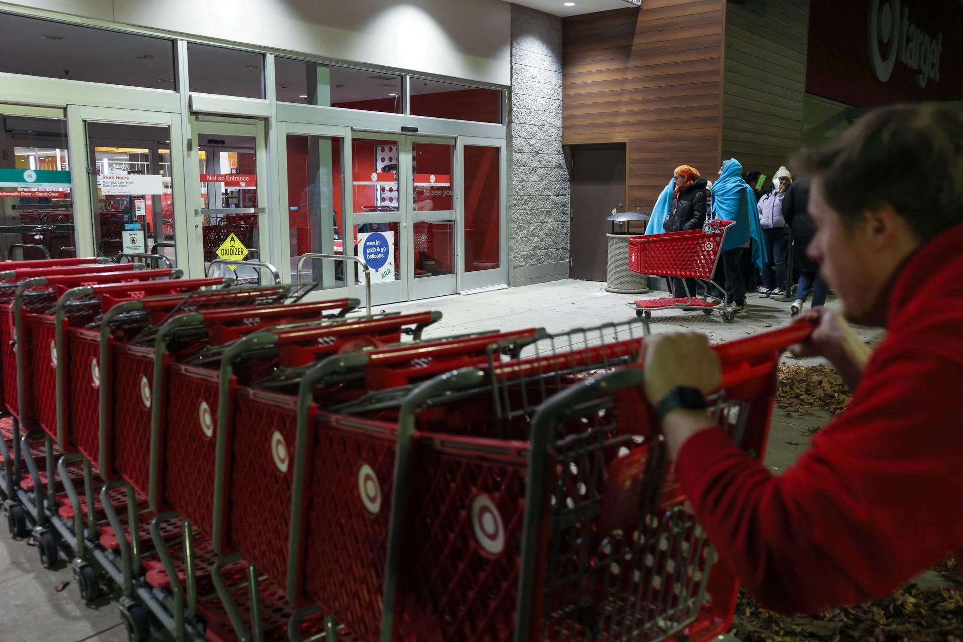 Shoppers wait outside a Target store for Black Friday deals. Westbury, New York. November 28, 2025. REUTERS/Shannon Stapleton