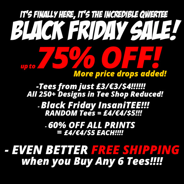 URGENT!!! There's LESS THAN 24 HOURS to GO in our Absolutely HUGE BLACK FRIDAY SALE!!! And We've REDUCED Even MORE T-Shirts to £4/€5/$6 or LESS! That's 75% off their normal price. If you buy 6 tees or more you get FREE SHIPPING!! And last but not least, our daily designs are reduced for the duration of the sale to just £7/€9/$11!!! This is literally the CRAZIEST sale we've EVER run! Stock will CERTAINLY be sold out by end of today, so this is your LAST CHANCE to Grab this unbelievable BARGAIN!!!!!