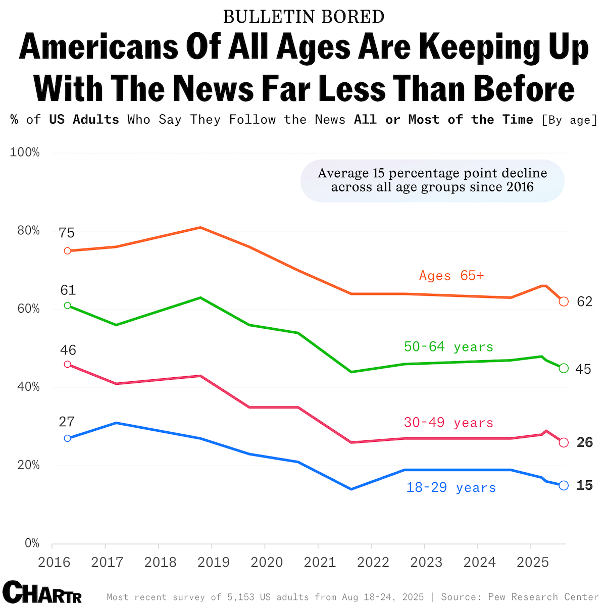 A survey update from Pew Research Center, published Wednesday, found that the overall share of US adults who reported following the news all or most of the time fell to 36% in August 2025 — a significant drop from the 51% recorded in 2016.
