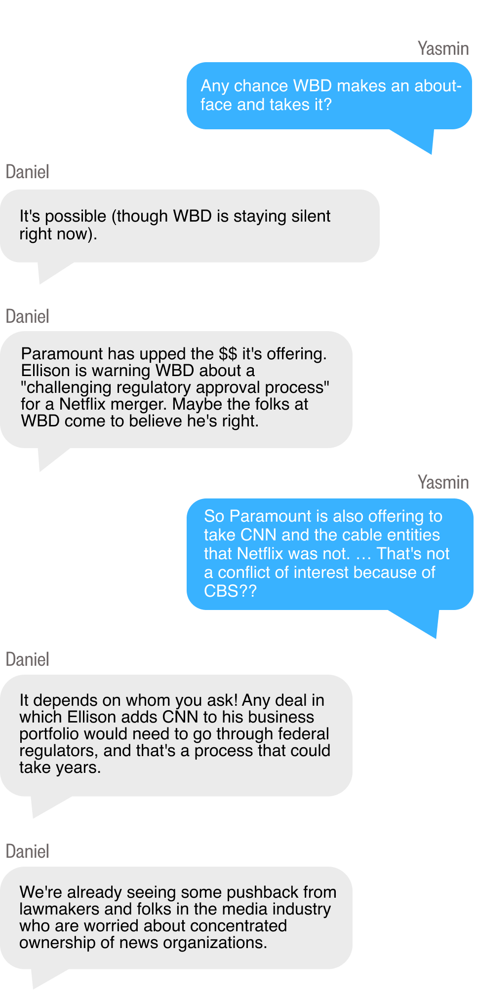 The Federal Communications Commission will have to approve any deal that goes through and the WBD board of directors said they will issue their recommendation in “accordance with the terms of their agreement with Netflix" within 10 business days. So we wait. I needed to know more so I reached out to Daniel Arkin, a senior reporter who covers a mix of everything, including the entertainment industry. |