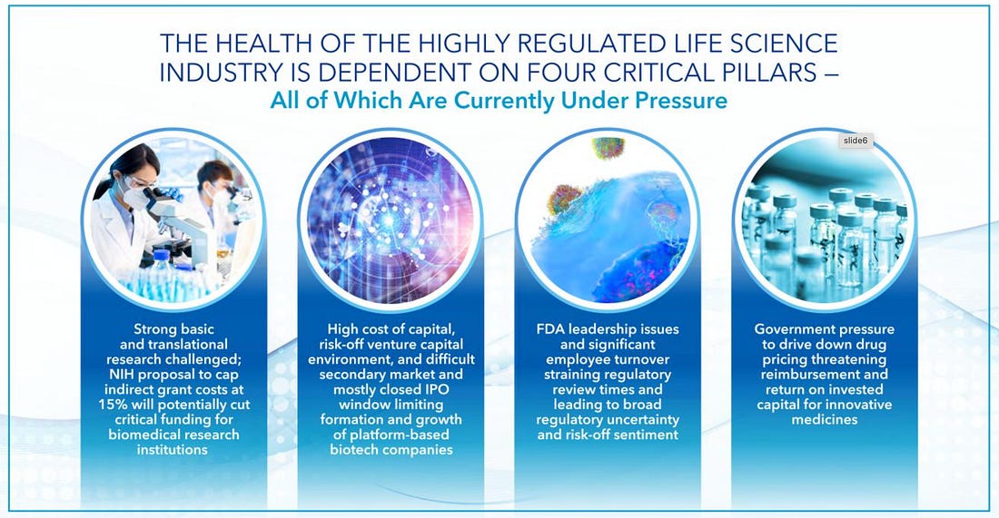 I wrote up Alexandria Real Estate Equities (ARE) a while back, and at first glance it looked like a solid high yield REIT with a dividend easily covered by profits. But we didn’t buy it, and a few weeks ago, they cut the dividend by 45%. Let’s show you what happened and what we can learn. Alexandria’s BusinessAlexandria is the premier landlord for the life science industry. They own massive “Mega Campuses” in innovation hubs like Boston, San Francisco, and San Diego. Their tenants are pharmaceutical giants, companies like Eli Lilly, Bristol Myers Squibb, and Moderna. They also rent space to earlier stage life science companies and the research departments of large universities. Even Google’s life science division Verily rents space from Alexandria. For a long time, this was a steady, growing business. But real estate relies on the health of its tenants. Why the cut?The issue isn’t Alexandria itself. The issue is that Alexandria has put all of its eggs in the life science basket. And life science and biotech companies are facing a perfect storm of issues right now. At their investor day, Alexandria’s management said that all 4 pillars of the industry are collapsing at once.