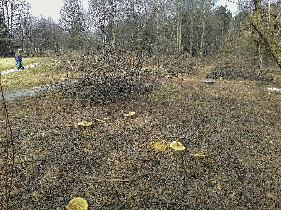 Drzewa wycięte zgodnie z ustawą z dnia 16 grudnia 2016 r. o zmianie ustawy o ochronie przyrody oraz ustawy o lasach (tzw. lex Szyszko) w parku Solvay w Krakowie. Zdjęcie: By Kamil Czaiński - Own work, CC BY-SA 4.0, Wikimedia