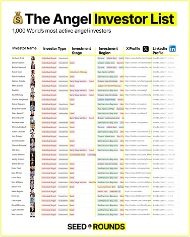 1. The Family Office ListA curated list of 1,000 active family offices investing in startups worldwide, including investment details, preferred stages, regions, and direct contact links. 2. The Angel Investor List1,000 of the world’s most active angel investors. 3. The AI Unicorn Angel ListAngels who backed Lovable, Cursor, Mercor, Polymarket, Synthesia & ElevenLabs (the people who consistently see the best deals early). |