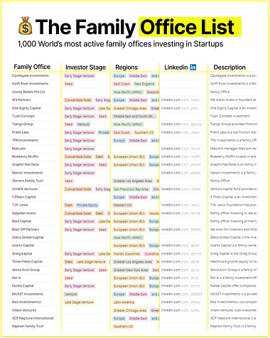 The Ultimate Investor List of Lists8 premium investor databases (6,600+ entries): 1,000 family offices, 1,000 top angels, AI unicorn angels (Lovable, Cursor, Mercor, Polymarket, Synthesia, ElevenLabs), 160+ investors who fund cold outrFundraising isn’t hard because “there aren’t enough investors.” It’s hard because you don’t have a clean system to answer: