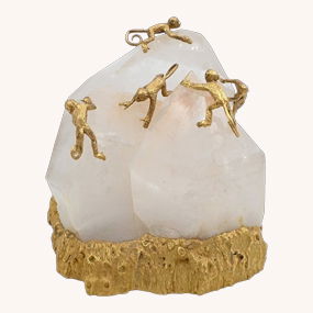 Featuring a large natural rock crystal cluster body mounted with five finely modeled 18K yellow gold monkeys, raised on a textured 18K yellow gold base, signed David Webb. Approx 30-50 t oz, base 11 1/2′′. Prov. Estate of Nina Silberstein.