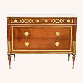 A late 18th-century Parisian neoclassical commode with a tan marble or granite top, four drawers, and finely chased gilt-bronze mounts, raised on tapered legs with sabots. Consistent with the work of Saunier’s workshop and furniture made for marchands-merciers such as Dominique Daguerre (34 × 45 × 22 in.). Prov. Sotheby’s 2006.