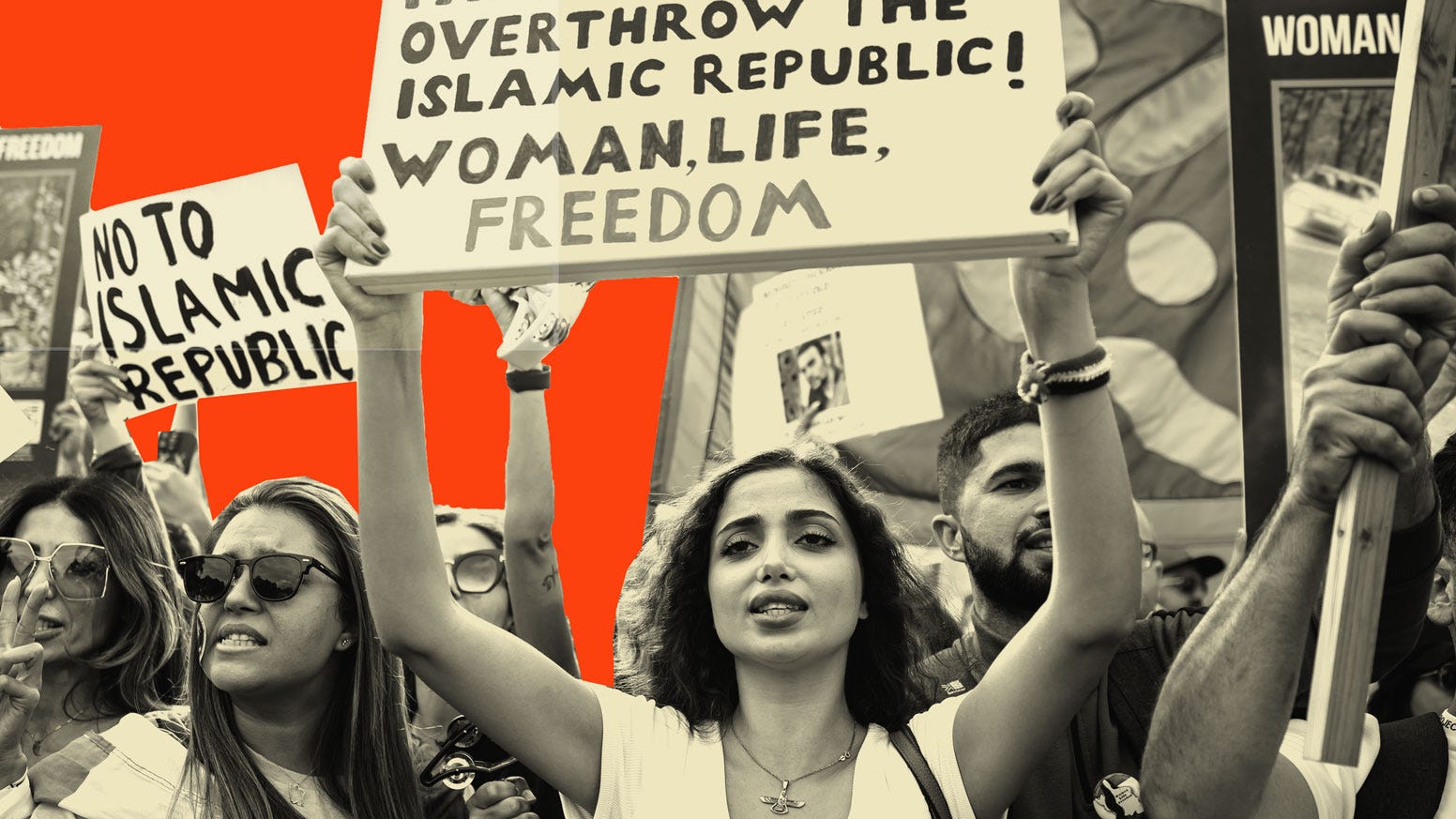 Protesters chant and hold banners as they take part in a march against the Iranian theocratic regime on September 16, 2023, in London. (Photo by Leon Neal/Getty Images; illustration by The Free Press)