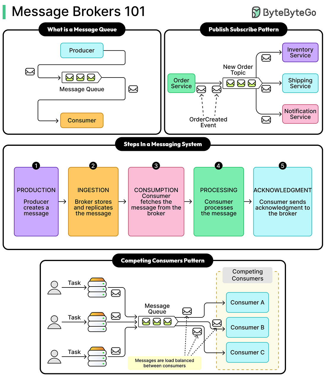 Latest articlesIf you’re not a subscriber, here’s what you missed this month. To receive all the full articles and support ByteByteGo, consider subscribing: A message broker is a middleware system that facilitates asynchronous communication between applications and services using messages. At its core, a broker decouples producers of information from consumers, allowing them to operate independently without direct knowledge of each other. This decoupling is foundational to modern distributed architectures, where services communicate through the broker rather than directly with one another, enabling them to evolve independently without tight coupling. To understand this in practice, consider an order-processing service that places an “Order Placed” message on a broker. Downstream services such as inventory, billing, and shipping will get that message from the broker when they are ready to process it, rather than the order service calling each one synchronously. This approach eliminates the need for the order service to know about or wait for these downstream systems. Message brokers are not merely pipes for data transmission. They are sophisticated distributed databases specialized for functionalities such as stream processing and task distribution. The fundamental value proposition of a message broker lies in its ability to introduce a temporal buffer between distinct systems. By allowing a producer to emit a message without waiting for a consumer to process it, the broker facilitates temporal decoupling. This ensures that a spike in traffic at the ingress point does not immediately overwhelm downstream services. In this article, we will look at how message brokers work in detail and explore the various patterns they enable in distributed system design. Fundamental Terms... |