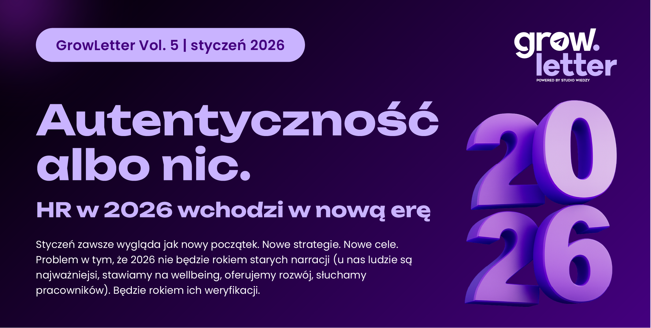 Dlatego ten numer GrowLettera otwiera coś więcej niż kolejny miesiąc. Otwiera rok, który stanie pod znakiem autentyczności - nie tej deklarowanej, ale sprawdzalnej w doświadczeniu, decyzjach i codziennej komunikacji HR.