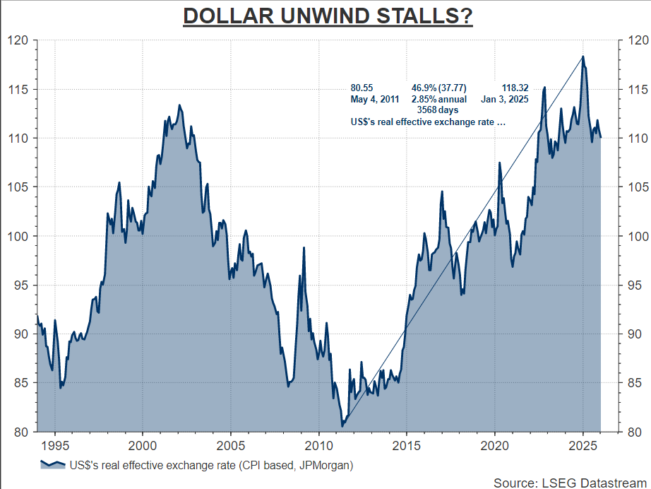 Whether today's apparent lull in safe-haven demand will have any staying power is an open question. Trump appears to be in wait-and-see mode concerning Iran, having still not ruled out the possibility of military action, his administration’s probe into Powell remains live, and global geopolitics are still fractious as the Trump administration refuses to backdown from its claim that it will acquire Greenland.