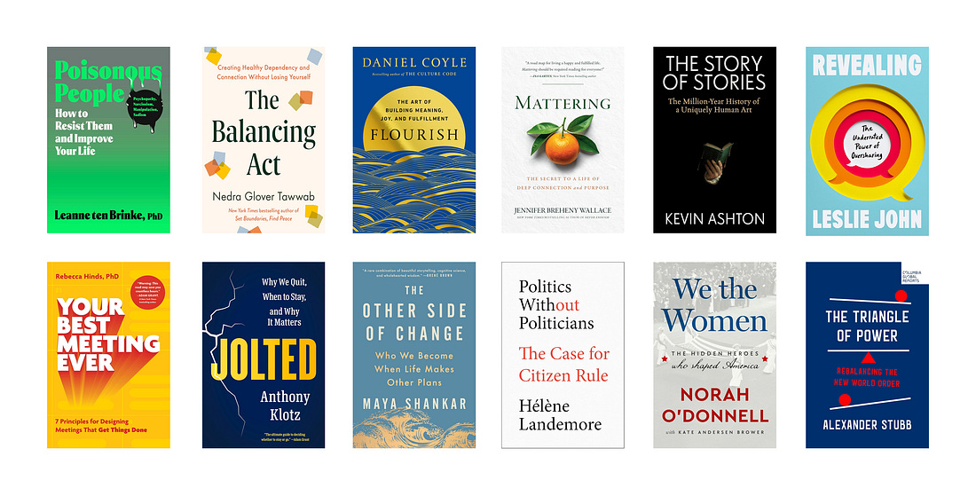 The New Books to Refresh Your Thinking in 2026How to set boundaries, boost well-being, enhance communication, navigate change, and improve civic life.Most information goes in one ear and out the other. Great books have a lasting impact on how we think and who we become. My favorite new releases this winter explore how to set boundaries, boost well-being, enhance communication, navigate change, and improve civic life. BOUNDARIES 1. Poisonous People by social psychologist Leanne ten Brinke (March) How to recognize, avoid, and neutralize narcissists, psychopaths, and Machiavellians. 2. The Balancing Act by therapist Nedra Tawwab (February) Walking the tightrope between setting boundaries and staying open. WELL-BEING 3. Flourish by journalist Dan Coyle (February) Why certain people, projects, and places make us feel alive. 4. Mattering by journalist Jennifer Wallace (January) Where we should look for purpose and contribution. COMMUNICATION 5. The Story of Stories by technologist Kevin Ashton (March) A journey through the hidden past and potential future of narratives. 6. Revealing by behavioral scientist Leslie John (February) The science and practice of healthy vulnerability. 7. Your Best Meeting Ever by management scientist Rebecca Hinds (February) Ways to eliminate pointless gatherings—and make the most of our time together. CHANGE 8. Jolted by organizational psychologist Anthony Klotz (March) How to decide whether to stay or leave your job—and other relationships too. 9. The Other Side of Change by cognitive scientist Maya Shankar (January) Finding purpose after adversity and possibility under uncertainty. CIVIC LIFE 10. Politics Without Politicians by political scientist Hélène Landemore (February) What if citizens ran the government? 11. We the Women by journalist Norah O’Donnell (February) The forgotten history of the heroines who shaped America. 12. The Triangle of Power by political scientist and head of state Alexander Stubb (January) The present and future of geopolitics, from Finland’s president and former prime minister. What books are you most excited about for 2026, and what was your favorite read of 2025? |