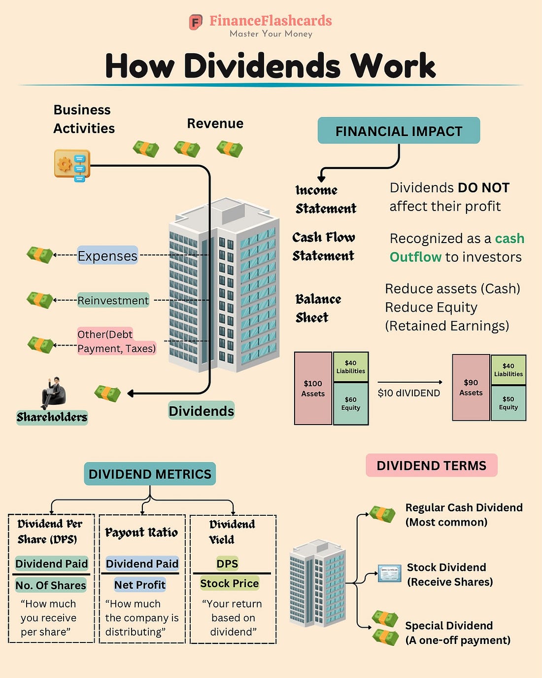 Today is Dividend Day. The series where I teach you 5 things about dividend investing in less than 5 minutes. 1️⃣ How Dividends WorkEver wonder exactly how a payout moves from a company's bank account to yours? This visual shows how the cash flows through the company, and the financial statements.