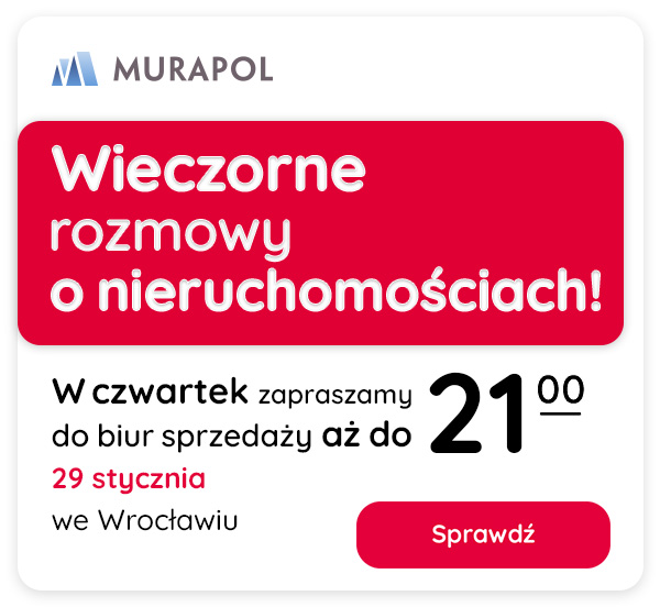 Współadministratorami danych osobowych są spółki z Grupy Kapitałowej Murapol. Dane będą przetwarzane do celów wynikających z prawnie uzasadnionych interesów realizowanych przez współadministratorów lub stronę trzecią, to jest do celów marketingu bezpośredniego dotyczącego oferty Grupy Murapol. Każdej osobie przysługuje prawo dostępu do treści swoich danych osobowych, ich sprostowania, usunięcia, ograniczenia przetwarzania, wniesienia sprzeciwu wobec przetwarzania oraz wniesienia skargi do organu nadzorczego. W sprawach związanych z danymi osobowymi prosimy o kontakt pod adresem: iod@murapol.pl. Więcej informacji w Polityce prywatności.