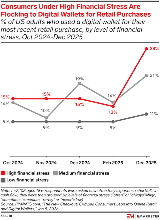 Key stat: 28% of US adults under high financial stress used a digital wallet for their most recent retail purchase in Dec 2025, up from 13% just 10 months earlier, according to PYMNTS.com. | | | |
