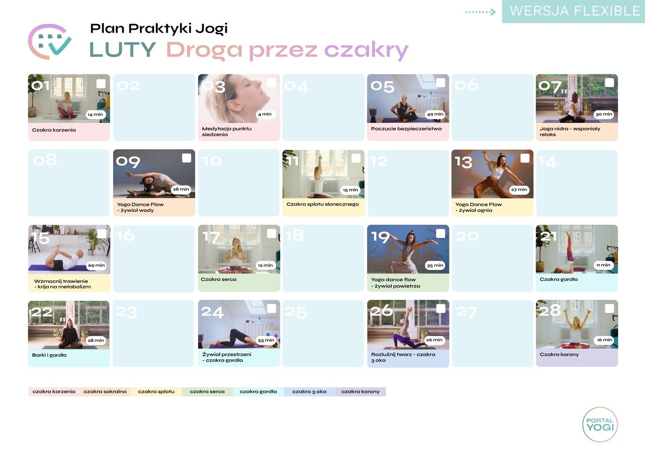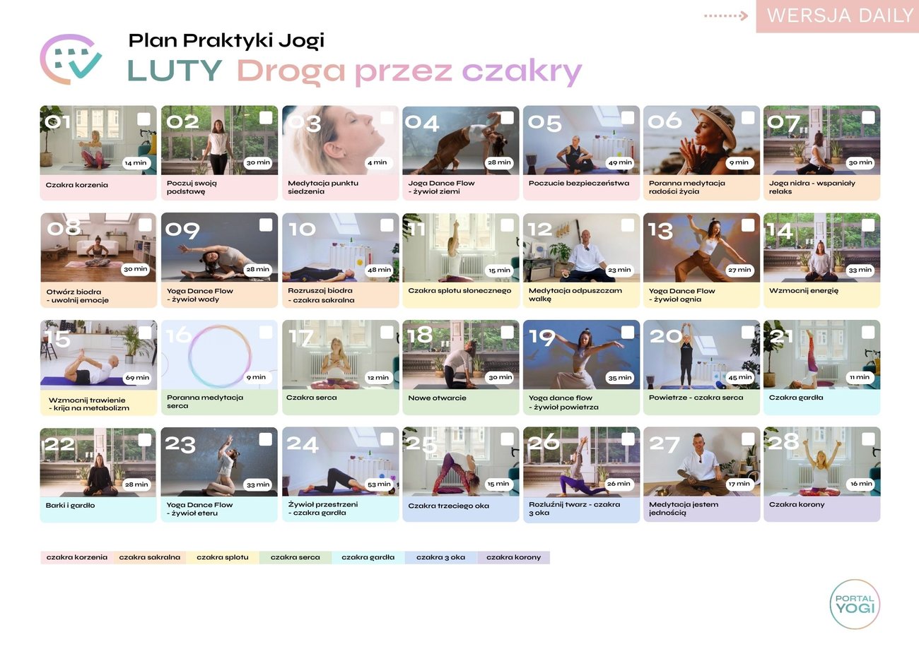 Praca z czakrami to nie tylko teoria. Już w lutym rusza specjalny Plan Praktyki: Droga przez czakry, który pomoże Ci zharmonizować energię i odkryć swój potencjał. Plan rozpisany jest w 2 wersjach intensywności, więc nie musisz martwić się, że nie dasz rady.