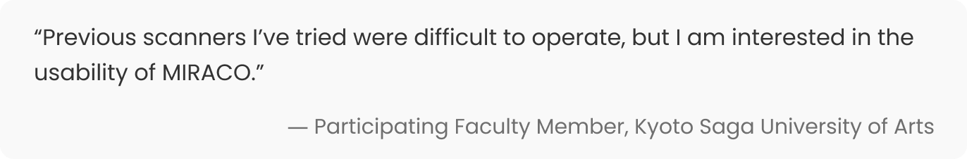 On December 12, 2025, a MIRACO demonstration was conducted during a practical class in the Living Design Department of Kyōto Seika University. Since the department had not yet introduced a 3D scanner, there was considerable interest in the device.