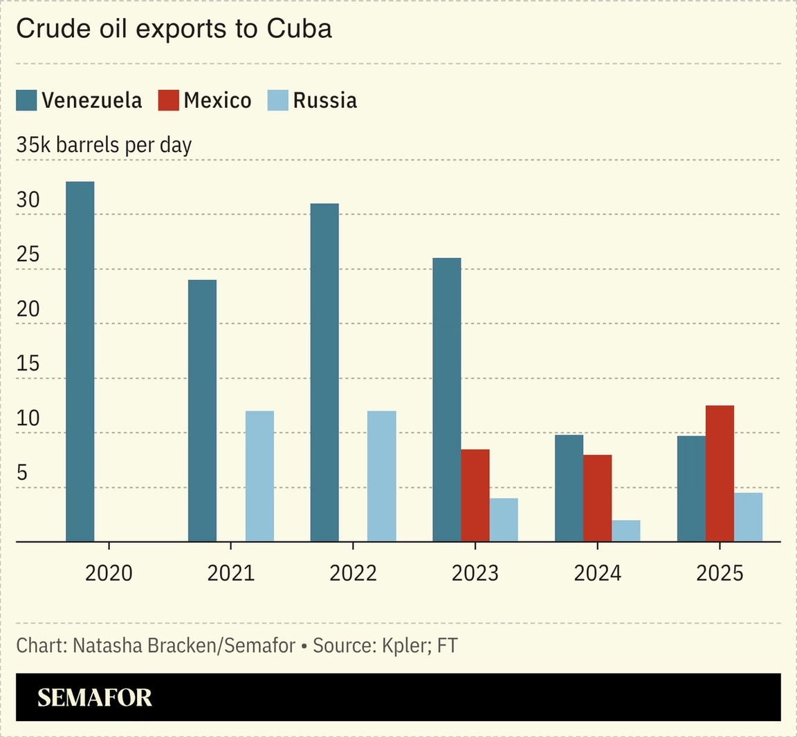 The US intensified pressure on Cuba and Venezuela, in each case by leveraging its dominance of oil exports. Mexico cancelled an oil shipment to Cuba following pressure from the US: Since Washington captured Nicolás Maduro, oil shipments from Venezuela to Cuba have plummeted, leaving Mexico as Havana’s biggest crude supplier. But the White House has urged Mexican President Claudia Sheinbaum to cut oil sales, with US President Donald Trump indicating he is looking to see the regime in Cuba fall. Sheinbaum nevertheless defended the move to halt oil deliveries as a “sovereign decision.” US Secretary of State Marco Rubio, meanwhile, showcased US control of Venezuela’s crucial oil exports less than one month after Washington ousted Maduro, testifying to a Senate committee that Caracas will have to submit a monthly budget, and the Trump administration’s review will determine how the funds from oil proceeds can be spent. The unusual arrangement has drawn comparisons to Iraq’s reconstruction, in which the US took control of Baghdad’s oil fund and lost track of $8.7 billion, Politico noted. |