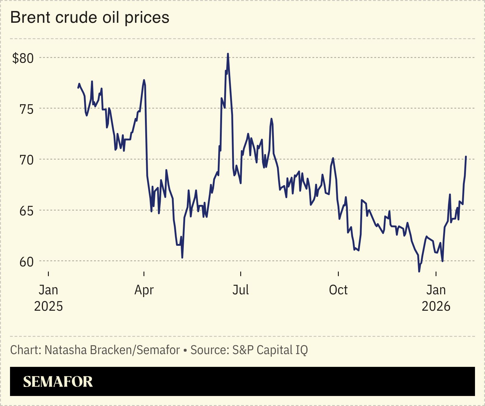 Growing signs that the US may be readying fresh strikes on Iran drove oil prices higher, but traditional crude producers may reap limited rewards from the increase. US President Donald Trump has warned of a “massive Armada” heading to Iran, adding that “time is running out” for the country’s leaders to agree a deal over its nuclear program, while Iran’s foreign minister has hit back that Tehran’s forces had their “fingers on the trigger”: CNN reported that Trump was weighing strikes because of limited progress in nuclear talks; the president had previously threatened a military response over Iran’s crackdown on protesters, but later backed off. The oil market response was in one sense predictable: Brent crude hit $70 a barrel for the first time since September, largely because a US military intervention could itself threaten crude production. Were Iran to respond by limiting access to the Strait of Hormuz — something it has previously threatened — prices could skyrocket, though as Semafor’s Gulf editor noted, regional producers wouldn’t necessarily benefit because their crude would likely be stranded. |