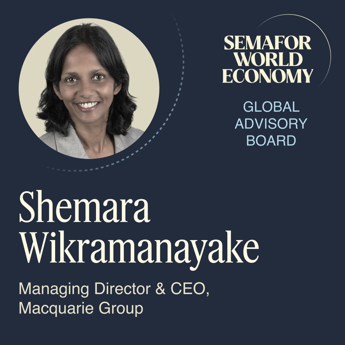 Shemara Wikramanayake, Managing Director & CEO, Macquarie Group, is joining the Semafor World Economy Global Advisory Board — a forum of visionary business leaders guiding the largest gathering of global CEOs in the US. The expanded board represents nearly every sector across the US and G20. Joining the Advisory Board at this year’s convening will be our inaugural cohort of Semafor World Economy Principals — an editorially curated community of innovators, policymakers, and changemakers shaping the new world economy with front-row access to Semafor’s world-class journalism, meaningful opportunities for dialogue, and touchpoints designed for connection-building. Applications are now open here. |