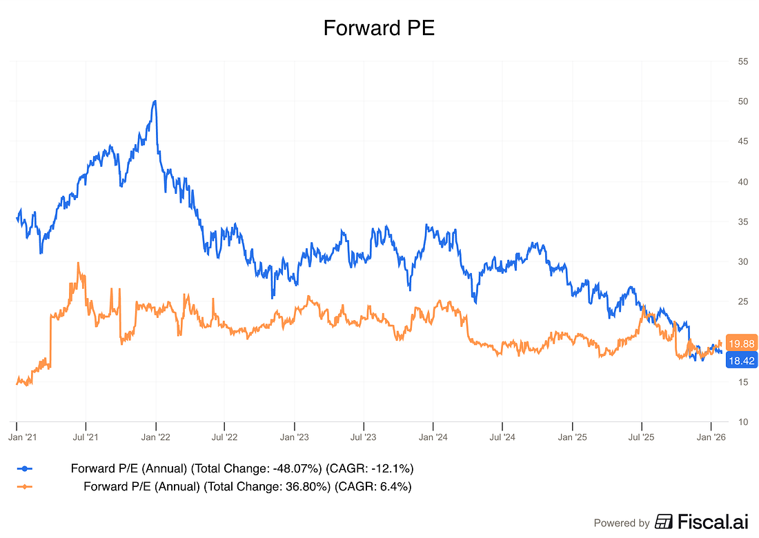 It’s time to make a portfolio switch. We will sell a low-growth company for another company with more upside potential. Let’s tell you everything you need to know. Let’s play a gameLet’s play a game before telling you which company we’re buying and selling. In the chart below you can see the Forward PE of both companies.