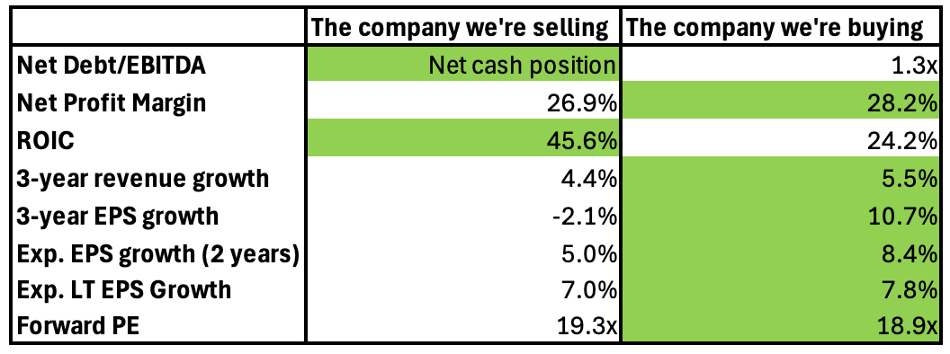 The company we’re buying became 61% (!) cheaper since 2022. It’s now cheaper than the company we’re going to sell. Now let’s compare the fundamentals of both companies: I’m mainly concerned for the low growth outlook of the company we’re selling.