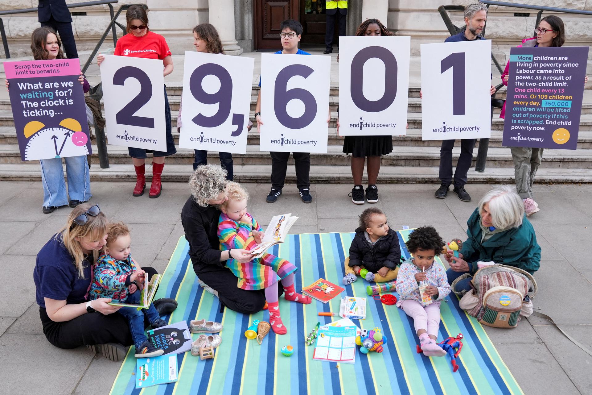 A protest outside the Treasury building, organised by the End Child Poverty Coalition, over the two-child limit to benefit payments, in London, Britain. REUTERS/ Maja Smiejkowska. |
