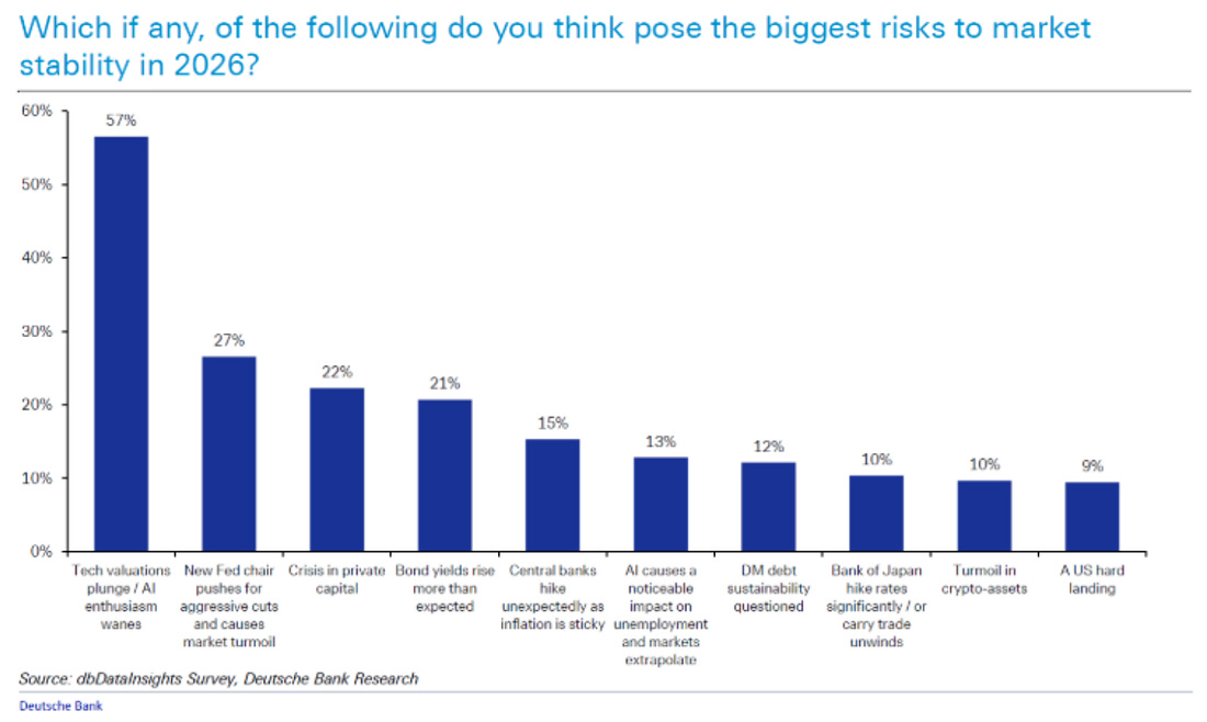 Today is Dividend Day. The series where I teach you 5 things about dividend investing in less than 5 minutes. 1️⃣ The Biggest Risks to MarketsA new survey from Deutsche Bank shows that investors are overwhelmingly worried about one thing: AI and Tech. Over half of those surveyed (57%) believe a crash in tech valuations is the biggest risk to the market in 2026. Other worries include: