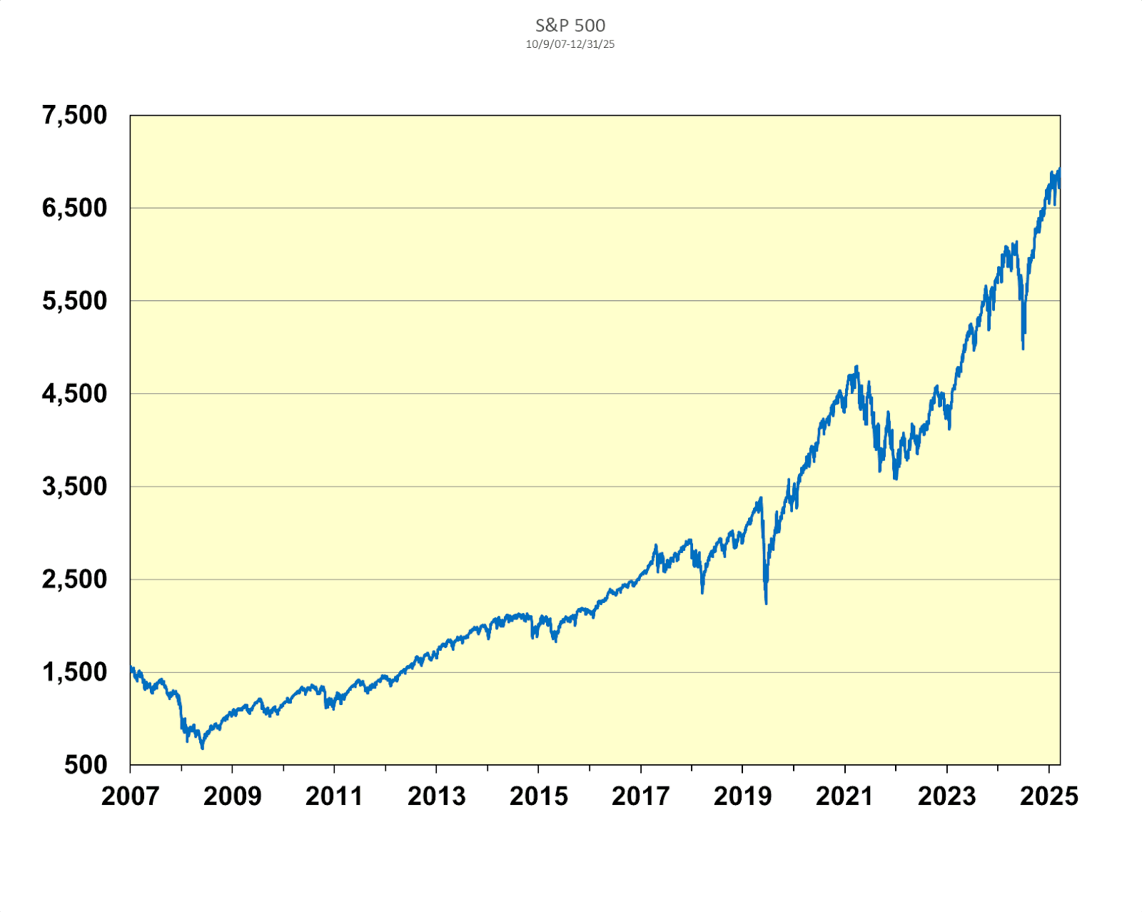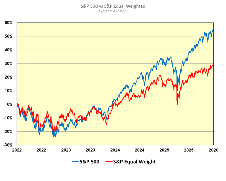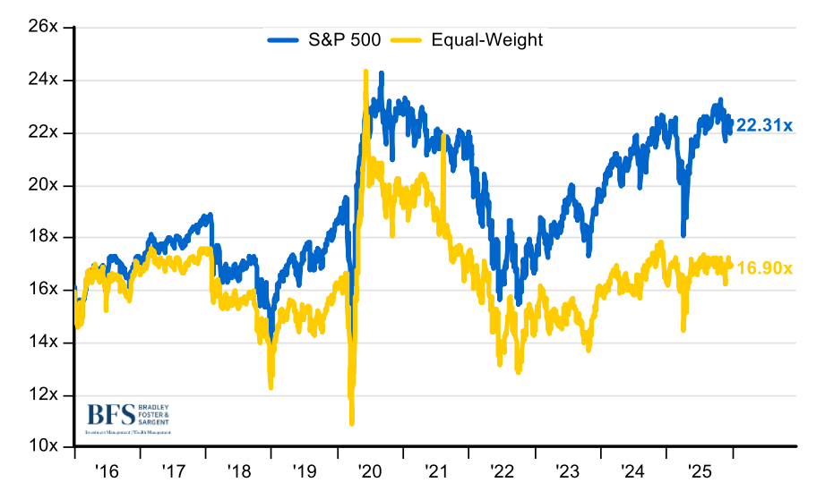 "Let me again suggest that the future has never been clear to me (give us a call when the next few months are obvious to you — or, for that matter, the next few hours)." — Warren Buffett, 1966 For many of us in the investment business, the first question that is often asked of us by clients and friends is: “Where is the market headed?” It seems an entirely appropriate question to be directed to investment professionals, since a large percentage of our waking hours is spent analyzing companies, industries, sectors of the stock market, and the stock market itself. When asked this question, it is, therefore, not surprising for many investment professionals to sound knowledgeable about the direction of the stock market — either because they think they can accurately forecast its short-term future behavior, or because it might be embarrassing for them to admit that they don’t know where the stock market is headed. At Bradley, Foster & Sargent Inc., however, we are not uncomfortable admitting that we don’t know which way the stock market is headed over the short term. And we find ourselves in very good company in this regard. What do investors such as Warren Buffett, Peter Lynch, and John Templeton have in common? All say that it is impossible to predict the direction of the stock market in the short term with any degree of regularity. Since the inception of the Standard & Poor's 500 Index in 1926, the Index has had a compound annual growth rate of nearly 11 percent (doubling roughly every seven years). And we believe the stock market will continue to reward investors with similar kinds of return well into the future, unless the country deviates from its engine of democratic capitalism, which has caused the United States to be the wealthiest country in the history of the world. Secular and Cyclical Bull Markets As we described in our last quarterly investment commentary, investors have been living in a “golden age” since the market bottomed in March 2009. In two months, this secular bull market will be 17 years old. During this period, the S&P 500 Index has advanced more than twelve-fold (total return). The chart on the following page illustrates one of the great secular bull markets in our history: Secular Bull Market S&P 500 Index 2007-2025 Source: Bloomberg It is important to differentiate between secular and cyclical bull markets. A secular bull market is a broad, multi-decade trend of rising stock prices driven by major structural shifts (such as technology), while a cyclical bull market is a shorter-term (often lasting a few years) uptrend occurring within a secular trend, often mirroring business cycles and experiencing smaller peaks and troughs. The U.S. stock market has been in a cyclical bull market for the past three years. Following the market downturn in 2022, when the S&P 500 had a total return of -18.1 percent, the market advanced robustly during the last three years, with the S&P 500 turning in a cumulative total return of 86.1 percent. Thus, long-term stock market investors have been the fortunate beneficiaries of both a long-running secular bull market and the recent cyclical bull market, as the chart below demonstrates: Cyclical Bull Market S&P 500 Index 2022-2025 Source: Bloomberg Where Do We Go From Here? But we don’t want to become complacent. As we have written before, trees don’t grow to heaven. Inevitably, things happen that cause the market to sell off. In order to plot a course forward, we need to know where we have been and where we stand now. The late historian David McCullough once wrote: “A wise historian once said that to try to plan for the future without a sense of the past is like trying to plant cut flowers.” As we move into 2026, let’s take a look at the current state of play. Currently, the valuation (price/earnings ratio) of the stock market is elevated by every measure. The chart below shows the rich stock market valuation compared with historical norms. While the market’s price/earnings ratio of around 22.3 on 2026 operating earnings is somewhat less than the extremes reached at the top of the “Internet bubble” in 2000, it is nonetheless 20 to 30 percent above historical averages. However, the good news is that the S&P 500 Equal Weight Index (which removes the unhealthy concentration of the top 10 stocks in the S&P) is trading at a much more reasonable valuation. The chart below shows this dichotomy: S&P 500 vs. S&P Equal Weight Index 2016-2025 Source: S&P, Invesco, FactSet In the most fundamental sense, stock markets (and stocks for that matter) advance because of two basic variables: earnings and valuations (prove/earnings ratios). If earnings grow while the price/earnings ratio remains stable, the market will advance in line with the earnings growth. If earnings remain flat but valuations increase, the market will advance in line with the expansion of the price/earnings ratio. If both earnings grow and valuations increase, one has the best of all worlds, as the market advances both from earnings growth and multiple expansion — a double whammy. Most analysts do not believe that the stock market’s price/earnings ratio will expand in 2026; it is already extended. But they seem comfortable with the elevated valuation and are not predicting a contraction. It seemingly appears as if investors have embraced a new paradigm in which the market’s price/earnings ratio should be 20 or more — well above the historical average of around 16.5 over the past 50 years. But once in a long while a paradigm shift does occur. During the latter half of the 19th century and the first half of the 20th century, there was such a paradigm shift. Until the early 1950s, U.S. investors required equities to have higher dividend yields than bond yields to compensate for equities’ inherently greater risk over investment grade bonds. Dividend yields dropped below bond yields, as investors prioritized the growth potential of stocks over bonds
