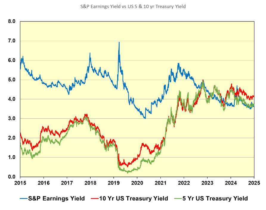 Bear Case The main reason why some investors are pessimistic about the stock market’s prospects in 2026 comes down to its expensive valuation. A good example of this pessimism is Berkshire Hathaway, which has amassed a war chest of $380 billion in cash and Treasury bills — dry powder for when valuations become more reasonable. In past commentaries, we have compared the earnings yield on the S&P 500 Index with the yields on the 10-year U.S. Treasury note. (The earnings yield is calculated by dividing the earnings or earnings per share by the price.) The chart on the following page shows the path of the earnings yield of the S&P 500 Index over the past 10 years compared with the yields on both the 5-Year U.S. Treasury note and the 10-Year U.S. Treasury note: S&P 500 Earnings Yield vs. U.S. Treasury Bonds Yields 2015-2025 Source: Bloomberg If investors are given the choice of investing in a risk-free 10-year U.S. Treasury note with a yield of 4.2 percent and the S&P 500 Index with an earnings yield of 4.3 percent, many investors will choose not to buy stocks, as the usual risk premium for stocks has disappeared. The parity between the earnings yield of the S&P 500 and U.S. Treasury notes is one of the fundamental facts supporting the bear case. In addition to the elevated stock market valuation, the list below chronicles other key reasons why some investors are not optimistic about the stock market in 2026: - A reversion to mean stock market valuations would mean a decline of 25 percent or more in the S&P 500 Index
