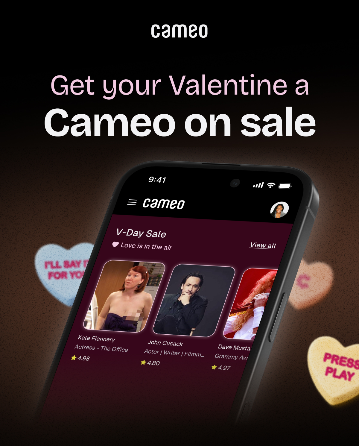 When John Cusack, Ice T, Kate Flannery, Dave Mustaine and over 2,000 more stars offer Cameos on sale... chocolate and flowers don't even come close!