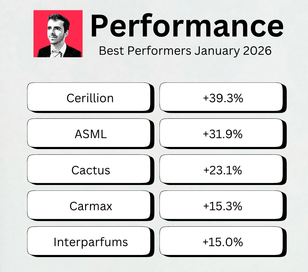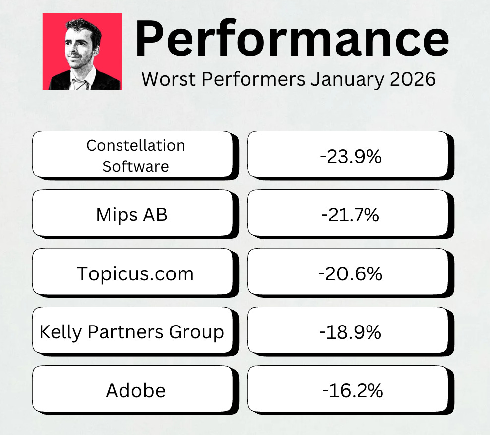 By monthly tradition, you’ll get an update on our Best Buys of the month. What’s going on in the markets? And what are our favorite stocks? Let’s get a little bit wiser today. January 2026The S&P 500 was up 1.3% in January Investors are ‘Neutral’ today according to the Fear & Greed Index: Best & Worst PerformersThis overview shows you the best and worst performers in our investable universe. Worst performersThe cheaper we can buy great companies, the better. Here are the worst performers of the past month: Do you know what Constellation Software, Topicus.com, and Adobe are have in common? They’re all software companies. I think the market offers great opportunities in this segment today. Best performersThese stocks did well over the past month: Now let’s dive into a very interesting topic: Should investors in software companies be worried about AI? Or is it a gift? |