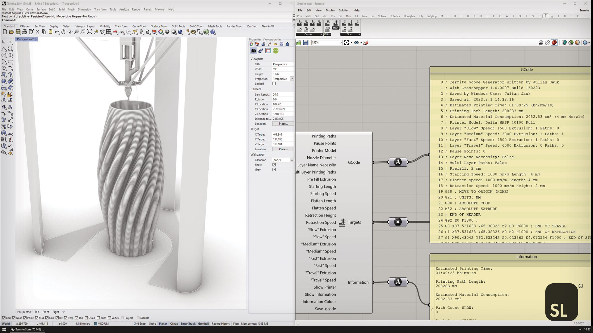 is a plugin for Liquid Deposition Modeling 3D printing, designed specifically for clay and other paste-based materials. The December webinar, Termite AI, is now in the food4Rhino webinars playlist . It focuses on an intelligent design co-pilot to help architects and designers in the early-stage design workflow.