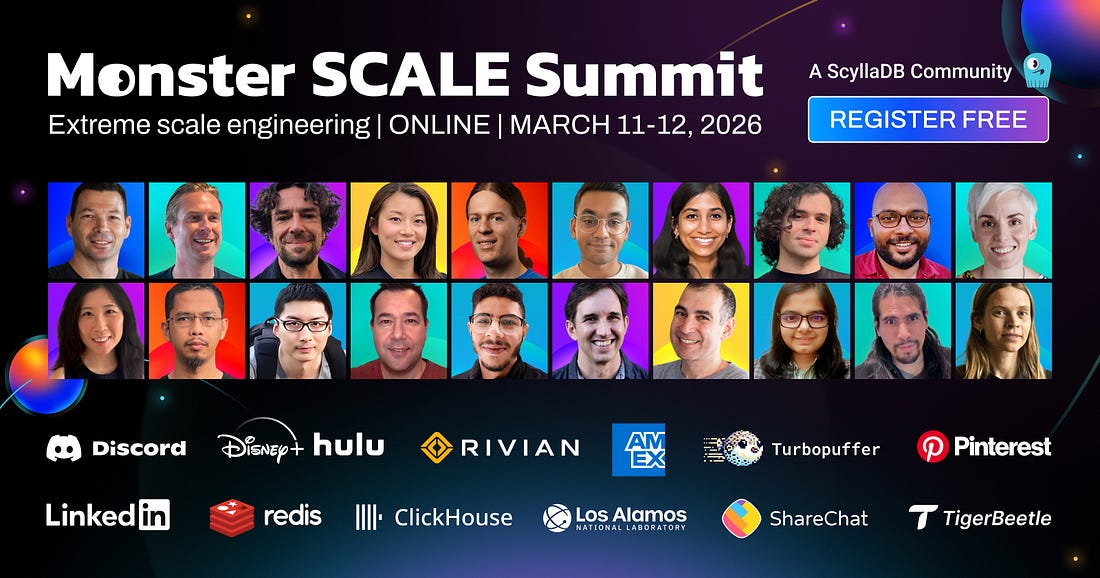 Your free ticket to Monster SCALE Summit is waiting — 50+ engineering talks on data-intensive applications (Sponsored)Monster SCALE Summit is a virtual conference all about extreme-scale engineering and data-intensive applications. Engineers from Discord, Disney, LinkedIn, Uber, Pinterest, Rivian, ClickHouse, Redis, MongoDB, ScyllaDB + more will be sharing 50+ talks on topics like: