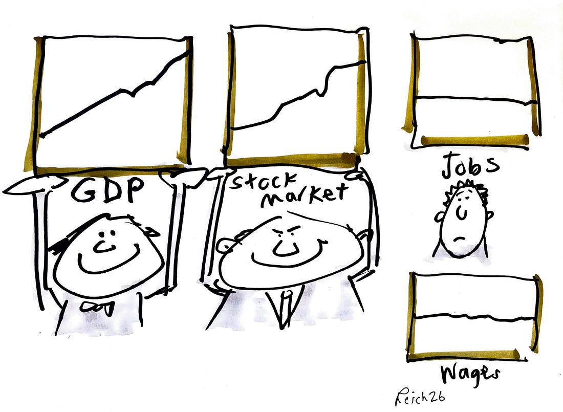 AI and the Coming Jobless EconomyAI will make most of us poorer and a few fabulously wealthy — unless its productivity gains are allocated fairly. Here’s what we should we be considering now.Friends, May I be candid with you about the U.S. economy? It’s growing nicely, and the stock market has soared. But on what really counts to most Americans — jobs and wages — it’s shitty. Hiring is almost at a standstill. The U.S. added an average of about 49,000 jobs a month in 2025, the lowest pace of job growth in more than two decades (outside the two most recent recessions). In January, the economy added just 22,000 private-sector jobs, according to payroll processor ADP. (The Bureau of Labor Statistics’ official jobs report for January will be released later today.) Wage growth has also slowed. And perhaps not surprisingly given the meager number of new jobs and the slowing of wages, consumer confidence has plunged below its pandemic-era depths. Is this jobless economy a harbinger of the future? Yes — to the extent it’s related to the spread of Artificial Intelligence (AI). Promoters of AI are working overtime to spin it as benefiting average people. Anyone who watched the Super Bowl ads for AI last Sunday saw how AI is being spun as a wondrous boon to humankind. Consider the breathless front-page headline in a recent Washington Post: “These companies say AI is key to their four-day workweeks.” The subhead was as euphoric: “Some companies are giving workers back more time as artificial intelligence takes over more tasks.” As the Post explained:
