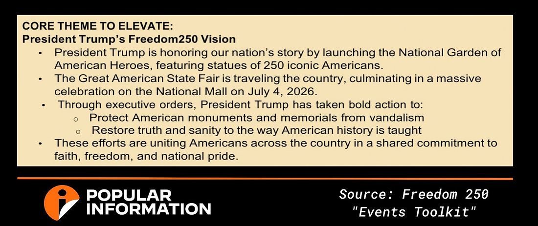 No corporate overlords. No false equivalencies. No BS. Upgrade to paid to support independent accountability journalism that makes an impact. Major corporations bankroll "America First" propagandaMastercard, Deloitte, and ExxonMobil are spending millions to promote events supporting Trump and his divisive political agenda.Major corporations — including Mastercard, Deloitte, and ExxonMobil — are spending millions to promote President Trump and some of his most divisive policy initiatives. The corporations are sponsoring Freedom 250, which bills itself as a “non-partisan organization leading the celebration of our Nation’s 250th birthday.” But internal documents obtained by Popular Information reveal that Freedom 250 is bankrolling events promoting Trump and his political agenda. Corporations pay between $500,000 and $10 million to become a Freedom 250 sponsor. Those who donate $1 million or more get invited to a private reception with Trump. For $2.5 million or more, sponsors receive a speaking role at the 4th of July celebration in Washington, D.C. The benefits for sponsors were first reported by the New York Times. Freedom 250 will purportedly use the money to host events across the country celebrating the nation’s 250th birthday. But an “Events Toolkit” produced by Freedom 250 and labeled “DRAFT DELIBERATIVE NOT FOR DISTRIBUTION” reveals the events will actually promote pro-Trump political talking points. For example, a “Talking Points & Messaging Guide” suggests partner organizations feature “issue-based messaging.” One featured message: “President Trump and America First leaders are restoring election integrity and protecting the voice of every legal citizen.” The idea that election integrity needs to be “restored” is based on the conspiracy theory, promoted by Trump, that the 2020 election was stolen. It also promotes the falsehood that “legal citizen” votes are being diluted by ineligible voters. The “Events Toolkit” also instructs organizational partners that the “CORE THEME TO ELEVATE” is “President Trump’s Freedom250 Vision.” This entails praising specific executive orders issued by Trump, including “Restoring Truth and Sanity to American History.” That order, which was signed last March, has resulted in “the removal of signs and exhibits related to slavery at multiple national parks.” New brochures at the former home of Medgar Evers, who was murdered by a member of the Ku Klux Klan, will no longer refer to Evers’ killer as “racist.” In other cases, signs “referring to the forced removal of Native Americans“ were removed from parks. Freedom 250 is now telling partner organizations to say that this kind of historical erasure is “uniting Americans across the country.” Other “talking points” explicitly call on partner organizations to align themselves with Trump’s political project: “[W]e’re proud to stand with the America First movement.” The document also calls on partner organizations to use Freedom 250 events to mobilize “America First” voters, urging them to pair rallies for “election integrity” and “parental rights” with “voter registration booths.” |