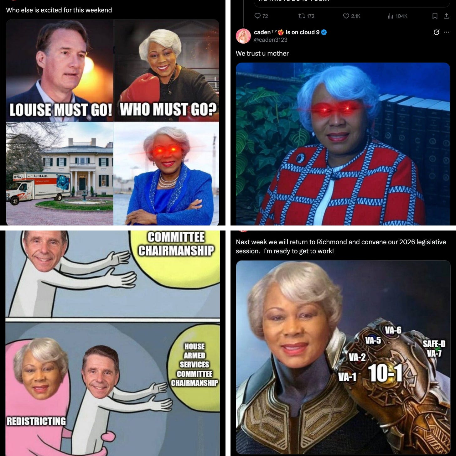 Hi, y’all. Welcome back to The Opposition. The mission of this newsletter is to chronicle the Democratic party’s path back to power and report on the voters, leaders, and candidates who are shaping that strategy. A lot of the time, that means I have to ask uncomfortable questions that push you all—and myself—to think outside our bubbles. It can be heavy stuff, especially when the stakes for the country are so high and it feels like there’s little room for error. But every now and then I come across a story that makes me laugh and reminds me that we can have some fun along the way. Today’s edition is one of those stories. You can get a taste below, although the whole hilarious thing is for Bulwark+ members. I hope you’ll consider becoming a member yourself—which you can do today at 20 percent of the regular price: –Lauren How an 82-Year Great-Grandmother Became a Masterclass Dem ShitposterMeet the unstoppable L. Louise Lucas.THE DEMOCRATIC PARTY HAS SPENT much of the last year trying to rival the GOP’s online dominance. Donors have sunk millions of dollars into new projects aimed at building networks of left-leaning content creators; members of Congress have tried to perfect the art of the direct-to-camera video (with varying degrees of success); Sen. Chris Murphy of Connecticut and Illinois Gov. JB Pritzker are among the many Democrats who have started their own Substacks; and party leaders like California Gov. Gavin Newsom have added “podcast host” to their resumes. The conventional wisdom has been that this is all part of a generational shift, one sparked by young politicians like Mayor Zohran Mamdani and Rep. Alexandria Ocasio-Cortez, two charismatic thirtysomething New Yorkers whose aura-farming skills are self-evident. But in recent weeks, it’s been an octogenarian Democrat with no national footprint who has been making some of the biggest waves online: Virginia state Sen. L. Louise Lucas. As the Democratic party has raced to keep up with Donald Trump’s mid-decade redistricting scheme, the 82-year-old Lucas, president pro tempore of the Virginia Senate, has played a leading role in state Democratic lawmakers’ efforts to pass a new map—one that favors their party ten to one, which would be a significant shift from the current breakdown of six Democrats to five Republicans.¹ And Lucas has been making her case on X, shitposting about other Democratic-controlled states that have dragged their feet on redistricting and talking trash about her GOP opponents. Throughout the redistricting fight, she’s made memes of herself as Thanos collecting the Infinity Stones (or, in this case, congressional districts). She’s trolled her Republican rivals, as with this meme making fun of GOP Rep. Rob Wittman for reportedly complaining in private about the redistricting effort (Wittman will likely lose his seat if the new map is approved). Although the Dark Brandon meme felt cringe by the end of the Biden administration, the beaming red laser eyes somehow work for Lucas. She’s shown remarkable fluency in internet slang—from “cuck” to “OOMF”—especially for someone who was born before D-Day. ![]() Last week, Lucas made national news for hitting back at Texas Sen. Ted Cruz after he complained about Virginia Democrats’ proposed new map, posting: “You all started it and we fucking finished it.” It’s that willingness to punch back that has earned her praise from national party figures, including Ocasio-Cortez and Pennsylvania Rep. |