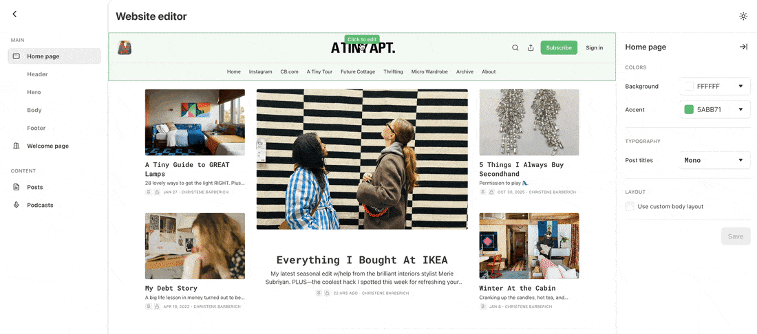 New on Substack: Publication design settings, recipe embeds, and live video scheduling on Android and desktopDesign your space, publish richer posts, and boost turnout for your live videoToday, we’re rolling out a set of updates designed to give publishers more control over how their work appears and reaches their subscribers, from new formatting options for publications and recipes to scheduling livestreams on Android and desktop. Publication design settingsWe’ve made a number of updates to the theme editor that make it easier than ever to shape the experience subscribers have when they land on your publication’s homepage. ![]() Here’s what’s new: