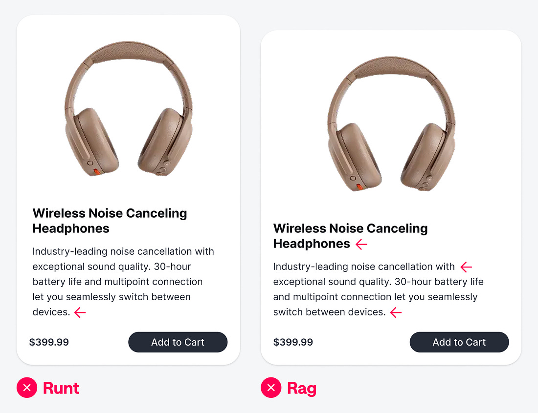 When users read your content, they develop a natural reading rhythm. However, rags and runts can disrupt it. A rag refers to the uneven, irregular edges of body text. A runt is a short line that appears at the end of a paragraph, typically just one or two words trailing off alone. While rags and runts might seem like a minor detail, they create both visual and reading problems that affect user experience. As users read your body text, abrupt line breaks create an awkward pause in their reading momentum. When read aloud, this disjointedness becomes even more apparent. Continue reading this post for free in the Substack app |