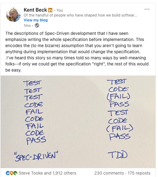 I invite you to upgrade to a paid subscription. Paid subscribers have told me they have appreciated my thoughts & ideas in the past & would like to see more of them in the future. In addition, paid subscribers form their own community of folks investing in improving software design—theirs, their colleagues, & their profession. Spec-driven or not spec-driven is not the question. The first question is, “What game are we playing?” Here’s the game I’m playing when I develop software, with or without the genie. I call it The Compounding Game: The first thing we finish will earn the resources for the next thing which will earn the resources for the next. Different Game, Different RulesHere’s The Finish Line Game, a different software development game: We want software that does X. Once we’ve reached X we’re done. It happens. I have some data. I need it munged. I write a munging script. Finito. I’ll never use that script again. The hidden assumption behind this style of spec-driven development is that we’re playing The Finish Line Game. Get the spec right. Get the desired software. Done. No need to consider the future because there won’t be one. Failure & Success in the Finish Line GameIf you’re playing The Finish Line Game, you can still fail. Design can be so bad you don’t cross the finish line. Tests can be so bad that you don’t notice that you haven’t crossed the finish line. The “finish line” itself can shift without you noticing. In the Tidy First world, we illustrate by contrasting “futures” & “features”. Futures are what all you can implement next. The genie is no good at managing futures. If you’re playing The Finish Line Game, you’re betting that features will cross the finish line before futures run out. This is “better agent.md file” territory. If we leave the genie autonomous, can we nudge its work to be good enough not to fail? Sometimes yes, sometimes no (in my experience). And the genie keeps getting better. But it’s still the same Finish Line Game. Playing The Compounding GameJust as football tactics won’t work on a baseball field, spec-driven development doesn’t work if you’re playing The Compounding Game. A better spec will never get you from dollar sign N to dollar sign N+1 forever. A better agent file won’t extend the lifespan of the system long enough to get from N to N+1. At some point the complexity will exceed the genie’s capacity & it’s game over with lots of dollar signs left to play for. |